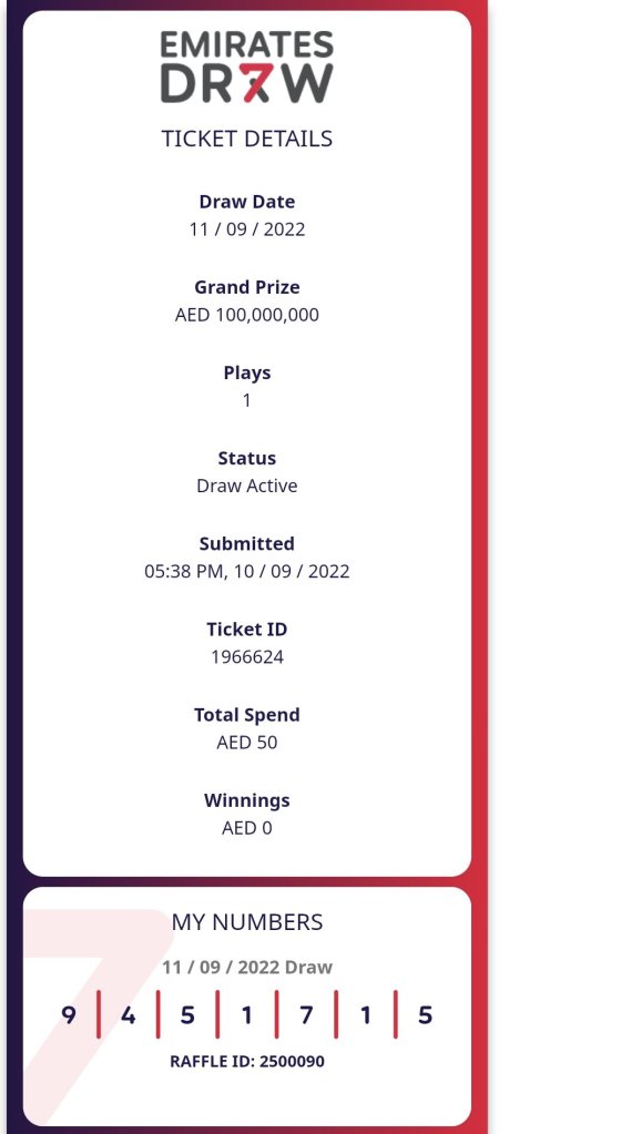 Ticket Numbers Emirates Draw Group -1 11/09 @ IST 10:30 PM